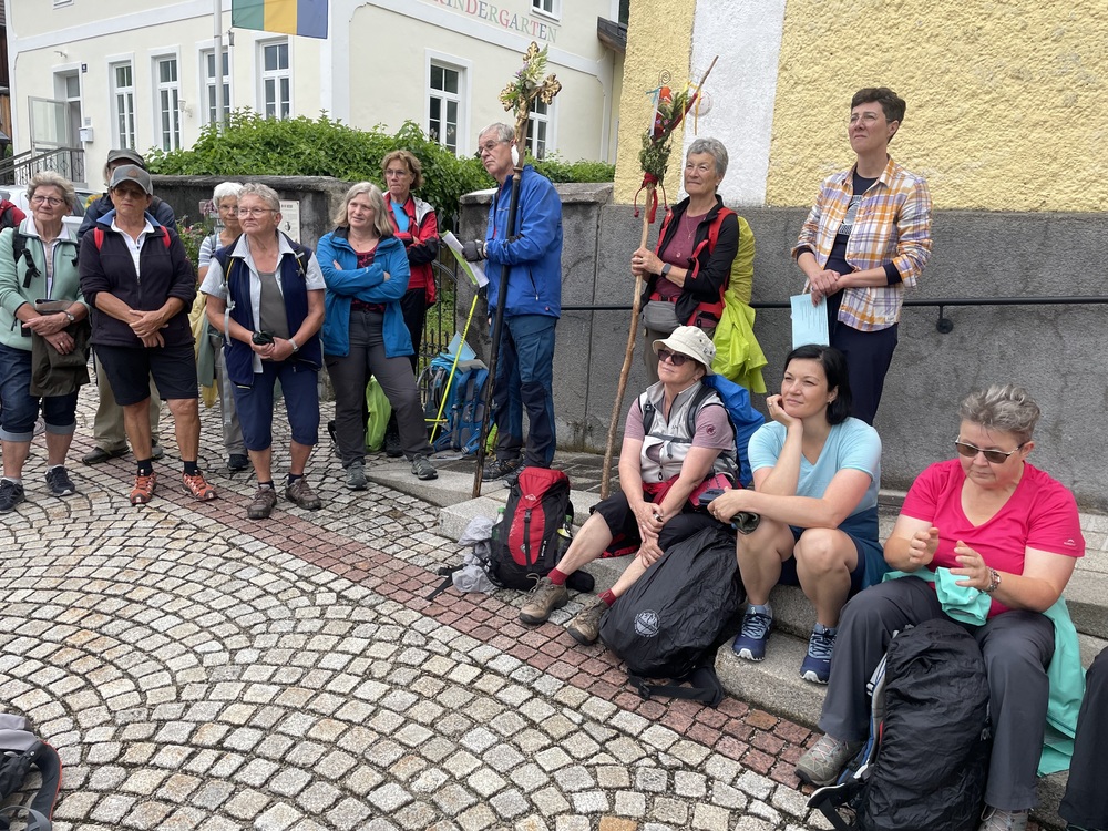 Immer weiter ins innere Salzkammergut hinein begegnet einem dieprägende und auch schmerzhafte Geschichte der Reformation und Gegenreformation. Am „Weg des Buches“ wurden von evangelischen Christinnen und Christen Bibeln geschmuggelt. Aus diesem Grund fand die erste Rast bei der evangelischen Kirche in Bad Goisern statt, wo Helga Schmalnauer aus der evangelischen Gemeinde die Pilger willkommen hieß. Sie erzählte aus der Geschichte und berührte mit einer Anekdote aus der Zeit der Verfolgung: Frauen, die sich retteten, indem sie eine Bibel schnell in Brotteig geschlagen und gebacken haben, um die zu verstecken. Die Bibel, Gottes Wort, ist Lebensmittel.
