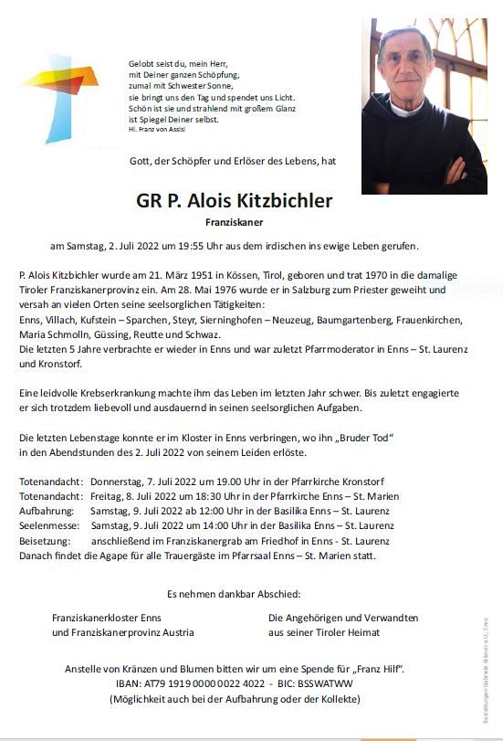 P. Alois ist am 2. Juli 2022 um 19.55 Uhr nach schwerer Krankheit daheim im Franziskanerkloster verstorben. R.I.P.