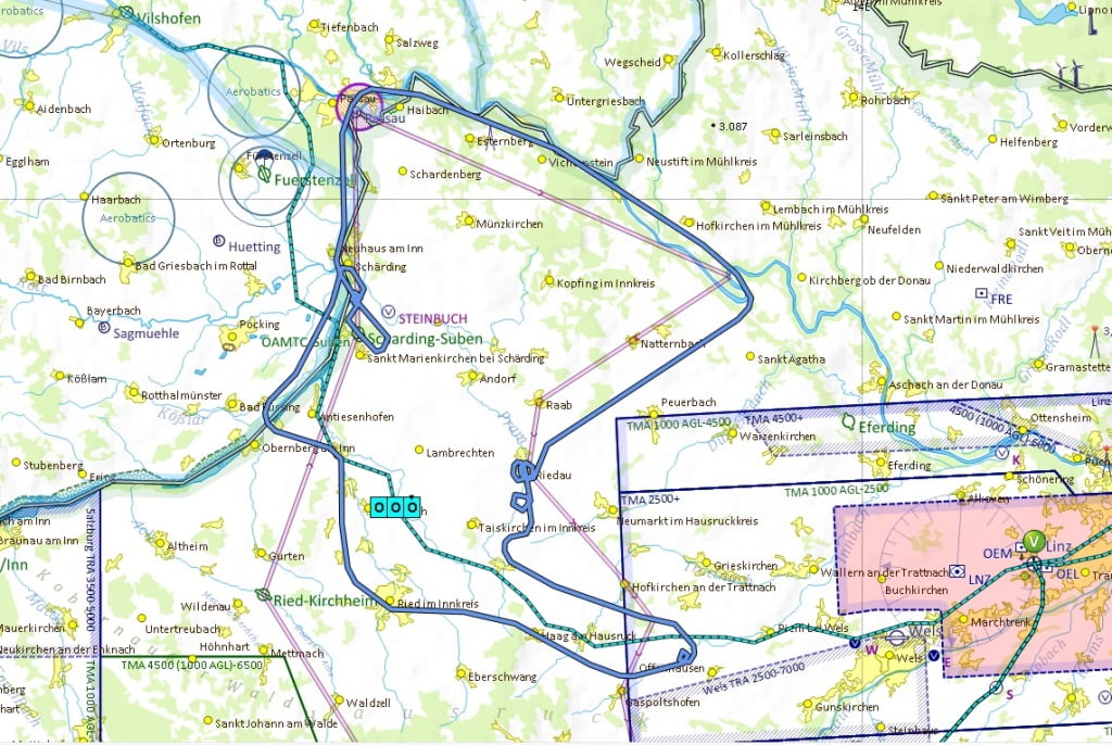 Es ging dann die Donau flussabwärts, vorbei am Stift Engelszell zur Schlögener Schlinge, ehe sie direkten Kurs Richtung Riedau nahmen. Über Riedau wurden ein paar Runden gedreht, bevor es weiter nach Dorf/Pram ging. Anschließend flogen sie zum Elternhaus von Pfarrer Karl Mittendorfer nach Meggenhofen, nahmen danach Fahrt über Ried im Innkreis weiter zum Stift Reichersberg auf, wo ebenfalls ein Kreis gezogen wurde, bevor sie wieder zur Landung in Suben ansetzten.
