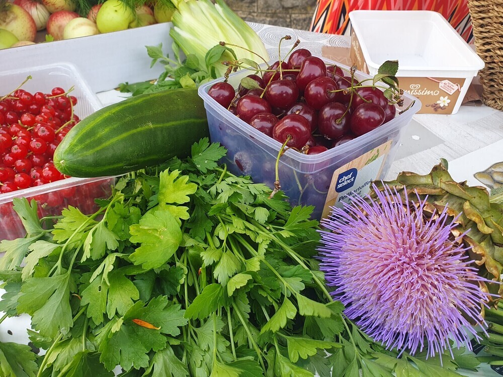 Nach dem Sonntagsgottesdienst werden Obst und Gemüse am Pfarrplatz angeboten.