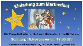 Der Hl. Martin ist unser Pfarrpatron. Deshalb möchten wir ihn mit einer Martinsfeier besonders ehren. Die Pfarre lädt alle Kinder und Erwachsenen ein in die Pfarrkirche zu kommen. Nehmt eure Laternen mit!